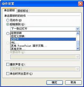 2、在“动作设置”窗口,选择“单击鼠标”下的“超链接到”,然后单击右边的向下箭头,选择“幻灯片”,如图: