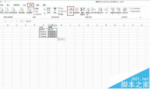 2、然后我们复制公式,粘贴到结果处,然后选择excel的”数据“——”分列“,最后点击完成,我们就会看到公式自动计算了,这种方式可以看出比方法一更方便实用。