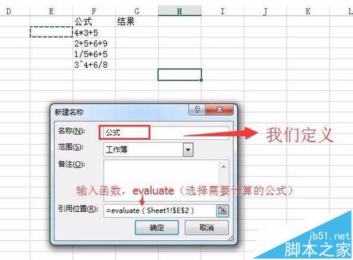 2、然后新建一个名称,引用位置处输入evaluate宏表函数:evaluate(选择需要计算的公式)