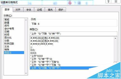 7、打开设置单元格格式对话框,选择自定义格式,设置类型为“"上升 "0;"下降 "0;持平;”,当大于0时显示上升+数值,小于0显示下降+数值,等于0则显示持平,除自定义格式外,也可以通过TEXT函数实现,区别就在于自定义不修改实际数值,不影响后续统计。