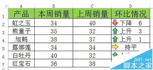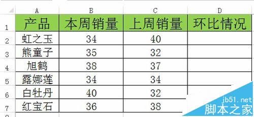 1、数据表格如图中所示,统计汇总了各个产品本周和上周销量的数据,最后D列数据为环比销量变动情况。