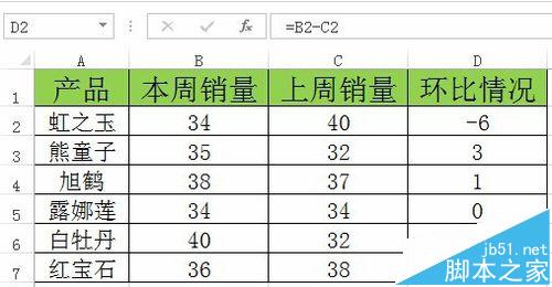 2、先来解决环比数据是如何来的,虽然很多同学都明白,还是啰嗦一下吧。在D2输入公式“=B2-C2”,填充至D7。