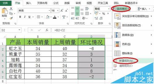 3、选择要设置条件格式的区域D2:D7,工具栏开始-条件格式-新建规则。