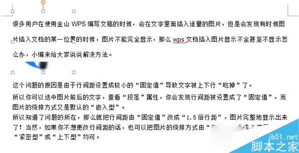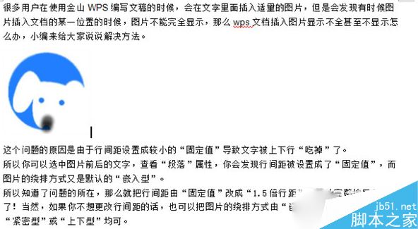 所以知道了问题的所在,那么就把行间距由“固定值”改成“1.5倍行距”,图片完整地显示出来了!当然,如果你不想更改行间距的话,也可以把图片的绕排方式由“嵌入型”改成“四周型”、“紧密型”或“上下型”均可。