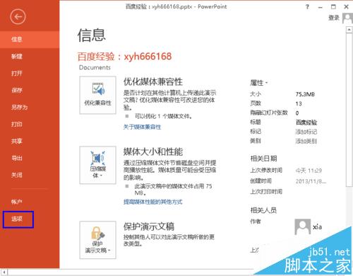 2、点击文件后,打开幻灯片的设置对话框,如下图所示,这里是很多设置功能的入口处,现在我们要使用的是左边列表最下面的“选项”
