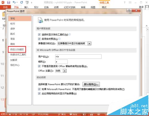 3、点击选项后,就打开powerpoint选项设置对话框,如下图所示,默认位于常规选项卡中,在左边的菜单列表中点击“自定义功能区”