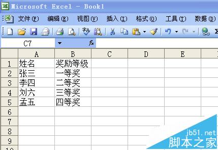 1、新建一张电子表格表单,把所要打印的姓名粘到一列,所涉及的奖励等级粘到另一列。命名,保存好。