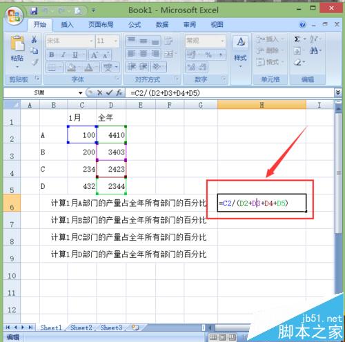 1、打开excel,输入内容。这里举例,计算各部门一月产量占全年全部部门的百分比情况。