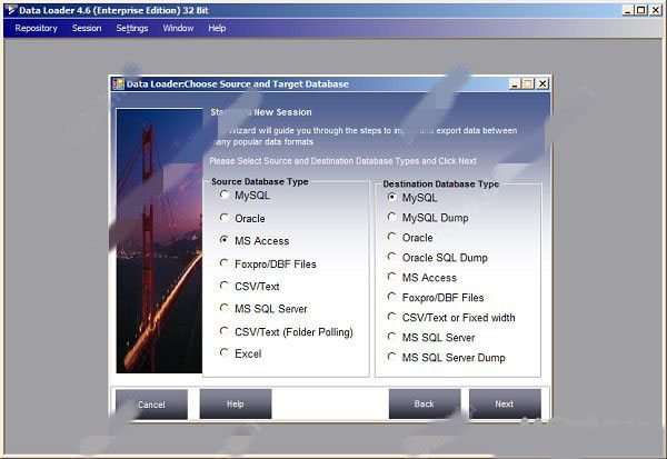 2、现在选择源和目标数据库类型,然后单击下一步。例如在这个游览中,我们将把一些表格从1转换成>数据库。选择源窗格中的和目标窗格中的,然后单击下一步。