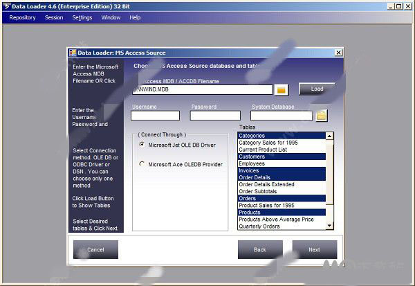 3、现在您将看到一个窗口来选择源数据库。单击浏览按钮以选择访问文件或键入 宋体">文件的路径和名称,然后单击加载按钮。然后你会看到该数据库中的表的列表。选择你想要转换成的表,然后点击下一步。例如,让我们转换类别、客户、发票、订单明细、订单和运货商表。