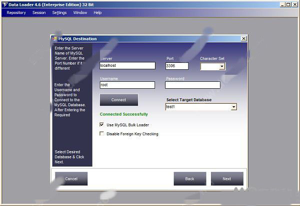4、现在您将看到一个窗口来选择目标数据库。输入用户名、密码、服务器名称和端口号,然后单击连接按钮来填充该服务器中的。