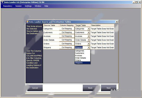 5、选择源数据库和目标数据库之后,您将看到如下所示的指定源表和目标表的窗口。如果需要,可以更改目标表名称或从“下拉”列表中进行选择。如果要过滤列,定义映射或指定条件或指定加载选项,那么当目标表已经存在时,然后单击下图所示的列按钮。