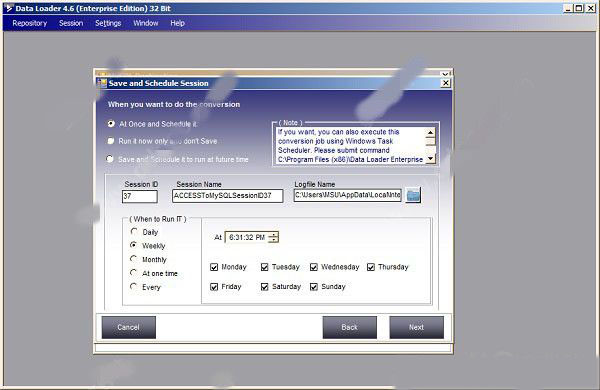 6、在指定了加载选项并过滤了任何列后,您将看到如下所示的窗口,现在选择是否要保存和安排会话,或只是现在只运行它,不想保存会话。输入会话名称或接受默认值并指定日志文件名称来记录会话摘要。指定“计划频率”以运行此会话。在此之后,Data Loader会将会话保存在资料库中,并会显示加载表单,如果您选择了立即执行转换的选项