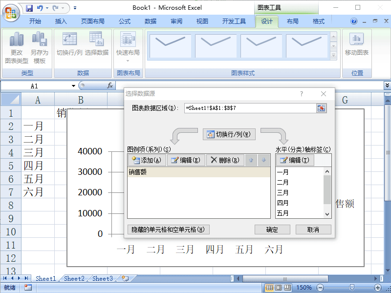 4、保存表格,选择菜单栏--设计--选择数据,在弹出的“选择数据源”窗口中,单击图例项中编辑按钮,弹出“编辑数据系列”对话框。