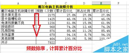 如图所示,频数排序,计算累计百分比。图表制作使用前3列数据。