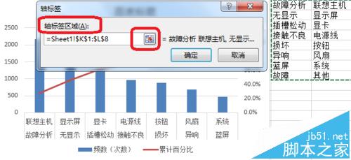 4、点击图表工具(设计)——选择数据——轴标签区域(如图所示,把原来的拆分成两列,是柏拉图的横坐标轴的数据显示如图所示)