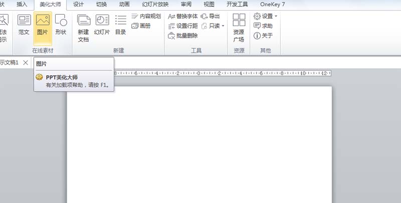 1、首先启动ppt2010,新建一文档,执行美化大师菜单,从中选择图片选项。