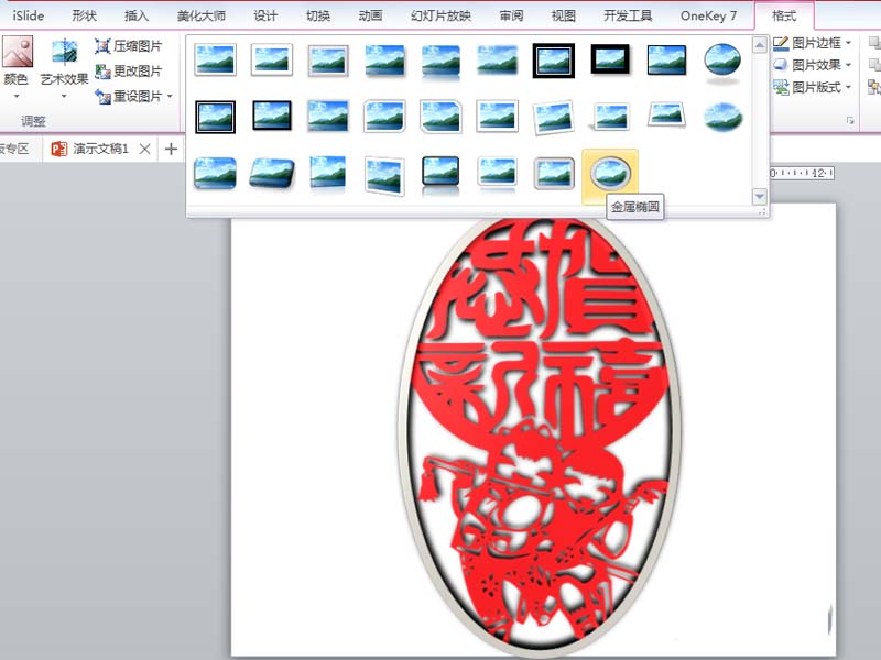 4、选择图片,执行格式-图片样式命令,从中选择金属椭圆,查看效果。
