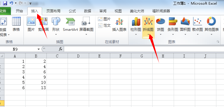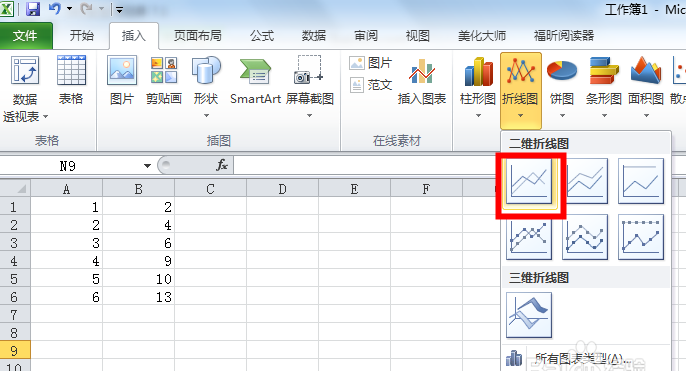2、点击“插入”,找到“折线图”,选择第一项,折线图