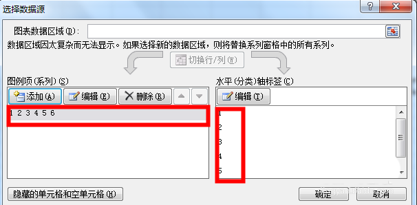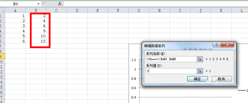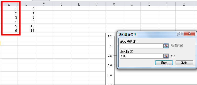 4、系列名称是X轴,也就是小编这里的A列,系列值是Y轴,也就是小编这里的B列