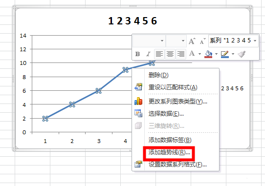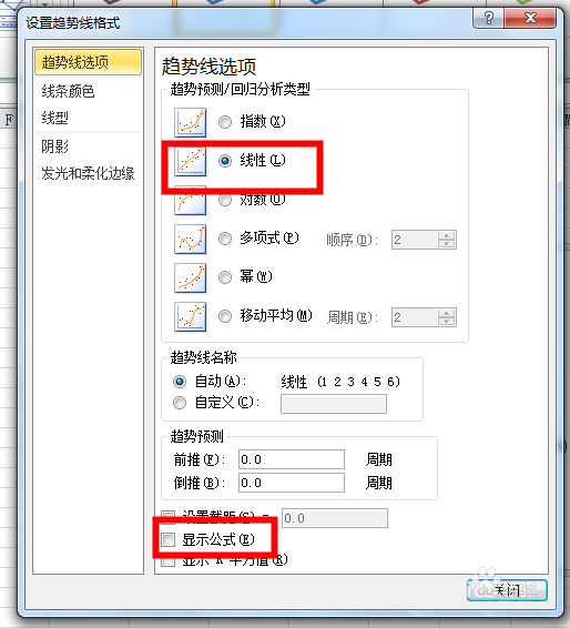 5、点击确定即可出现曲线图,右击曲线图,点击添加趋势线,在弹出的对话框中选择线性和显示公式,点击确定