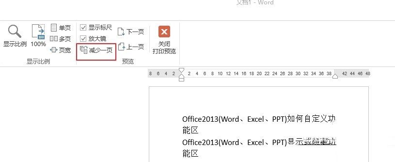 3、在“打印预览”选项中“预览”组单击“减少一页”。