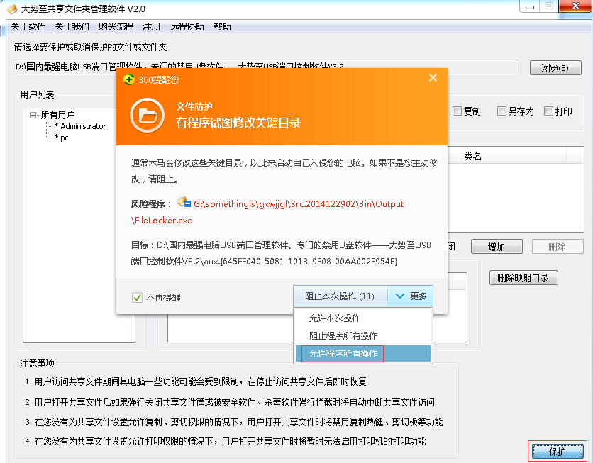作为国内首款专门保护服务器共享文件访问权限、设置局域网共享文件访问权限的软件——大势至局域网共享权限设置软件(下载地址:http://www.grabsun.com/gongxiangwenjianshenji.html)的安装和使用步骤非常简单,大多数情况下只需要点击“下一步”即可安装完成,然后点击软件顶部左上角的“启动保护”即可。但也需要注意以下几个问题: