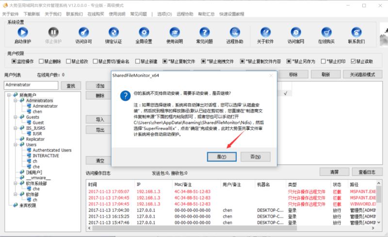 然后再次点击“启动保护”,在系统提示手动安装驱动的窗口上点击“是”,如下图所示: