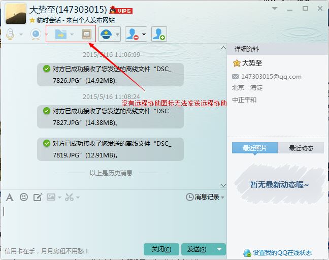 如果您发现对话框这里,无法找到远程协助的电脑小图标,无法点击“请求对方远程协助”,这是因为尚未添加QQ好友,同时无法添加QQ好友也无法发送QQ截图。如下图所示: