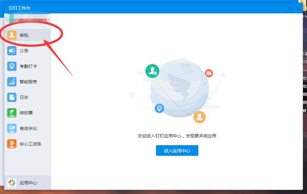 3、点击“工作”台之后,弹出工作台——点击“审批”,如下图: