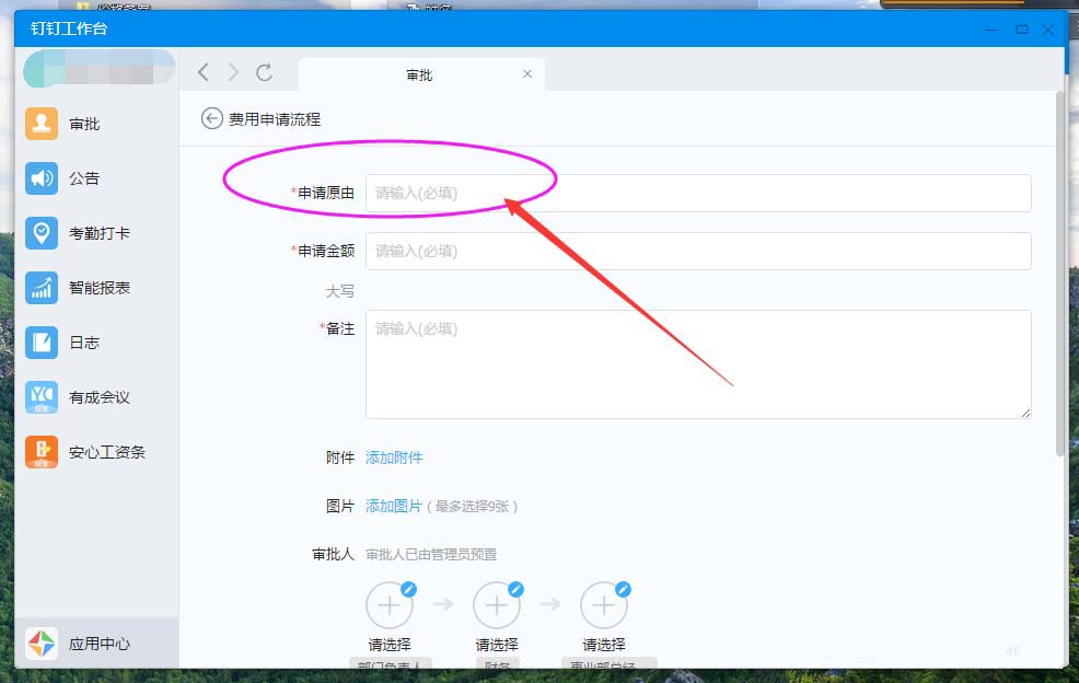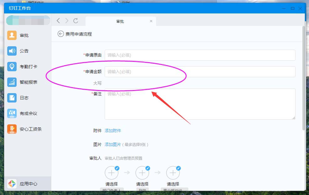 第三步:申请金额。“申请金额”根据软件使用设置,可自行设置大写,避免手工书写;如下图: