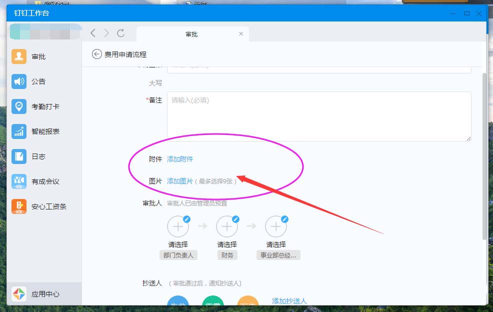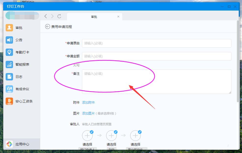 第四步:备注。“备注”即费用申请的特殊情况原由阐述说明皆可写在此处;如下图: