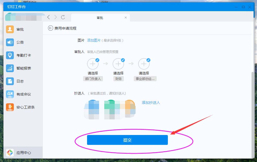 第六步:审批人&抄送人。“审批人&抄送人”即该申请需要审批和抄送的人员;如下图: