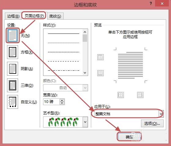 5、取消页面边框:在“设计”选项卡,“页面背景”组中单击“页面边框”按钮。打开“边框和底纹”对话框,在“页面边框”选项卡,将“设置”选择“无”,在“应用于”的下拉框中选择“整编文档”,然后单击“确定”按钮。