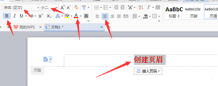 3、此时可以发现,整篇文档的所有页面,页眉都处于可编辑状态,这里对页眉输入文字“编辑页眉”,并通过文字工具对其设置:字体、颜色、位置等格式。