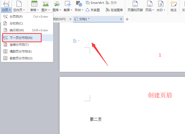 1、此时在图示箭头所指处,插入“下一页分节符”,对文章进行分节。