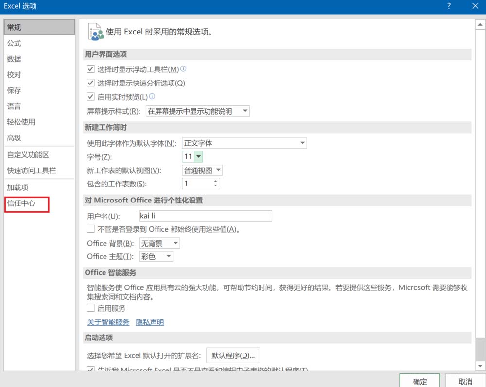 3、在弹出的设置窗口中,在左侧点击红框中的信任中心。