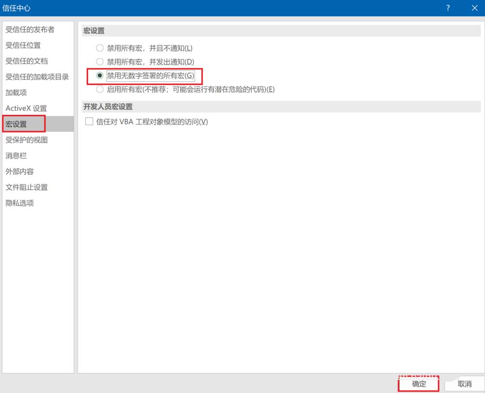 6、设置完成,通过这种方式,我们既可以实现安全宏的正常使用,又能保证不被非法病毒侵害。