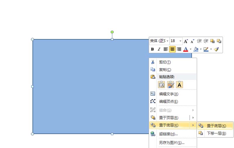 4、修改矩形填充颜色为浅蓝色,右键单击该矩形,从下拉菜单中选择置于底层选项。
