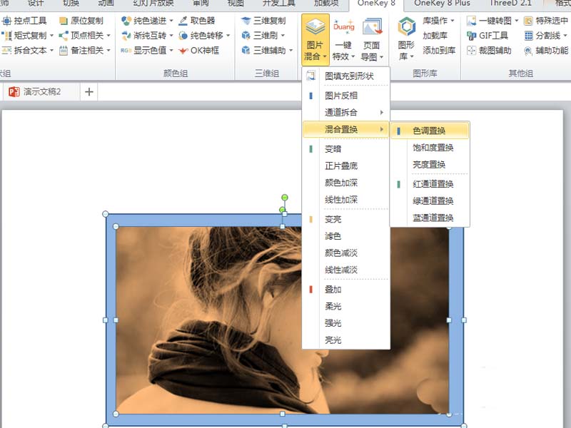 5、执行ctrl+a组合键全选,执行onekey-图片混合-混合置换-色调置换命令。