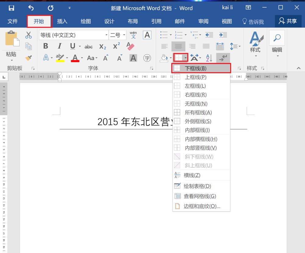 2、点击开始选项卡,单击边框按钮,然后选择下框线。