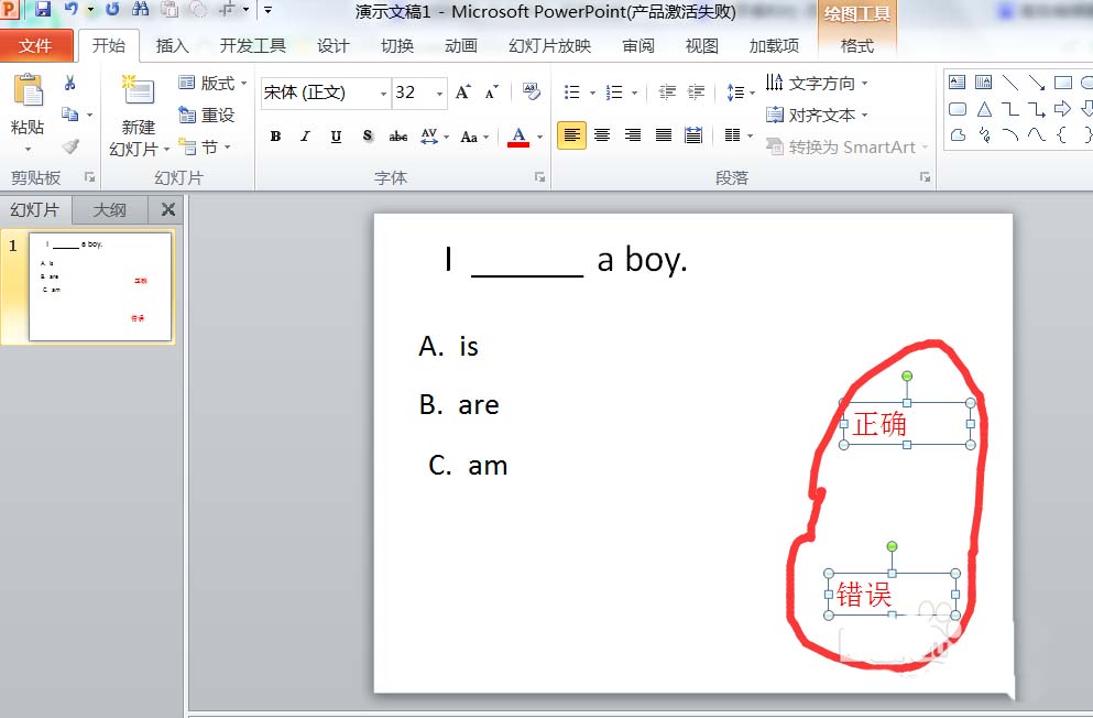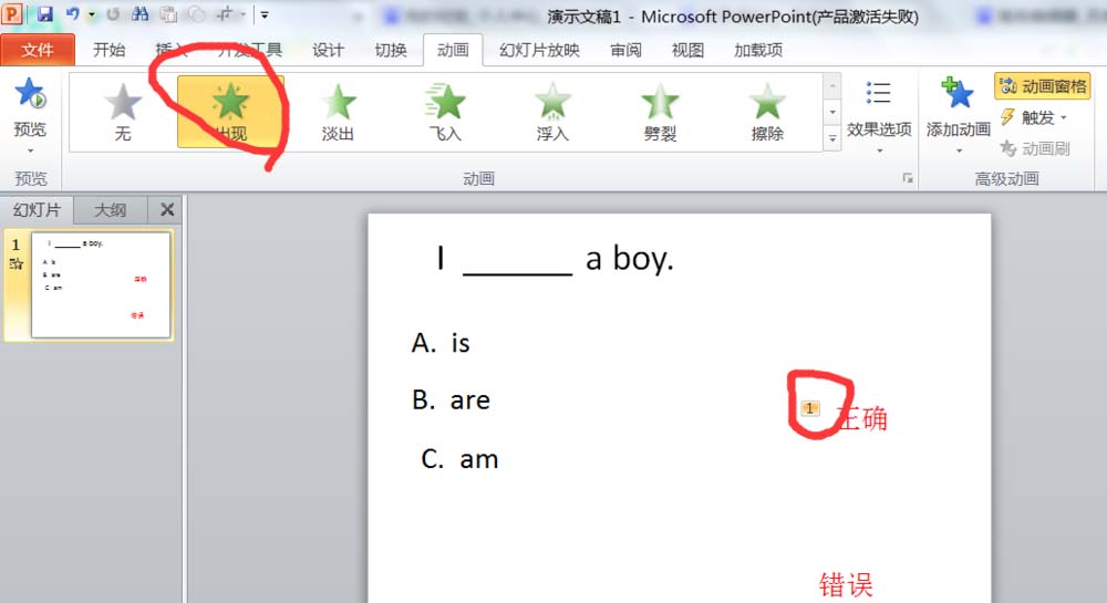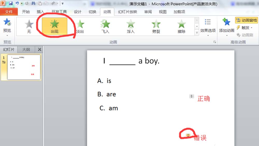3、重新选择两个文本框,编辑内容为“错误”和“正确”。然后分别对两个文本框进行动画设置为“出现”。