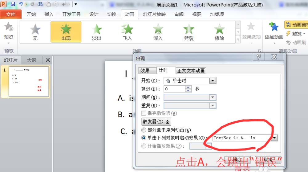 4、对“正确”的文本框设置动画的触发器,当点击C选项,就会触发动画效果。对“错误”的文本框设置动画的触发器,当点击A选项,就会触发动画效果。对“错误”的文本框设置动画的触发器,当点击B选项,就会触发动画效果。