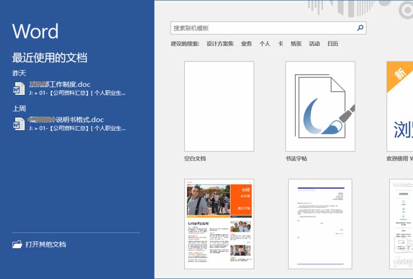 2、选择新建空白文档,显示Word 2016用户主界面。