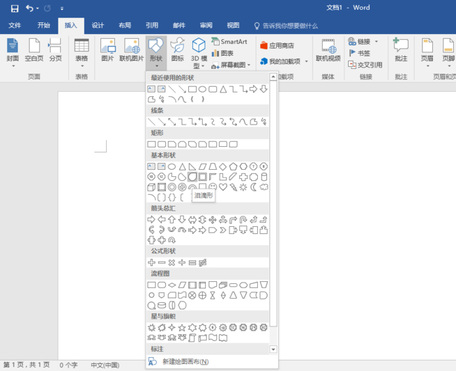 6、点击"形状"向下箭头,选择"基本形状→泪滴形"。