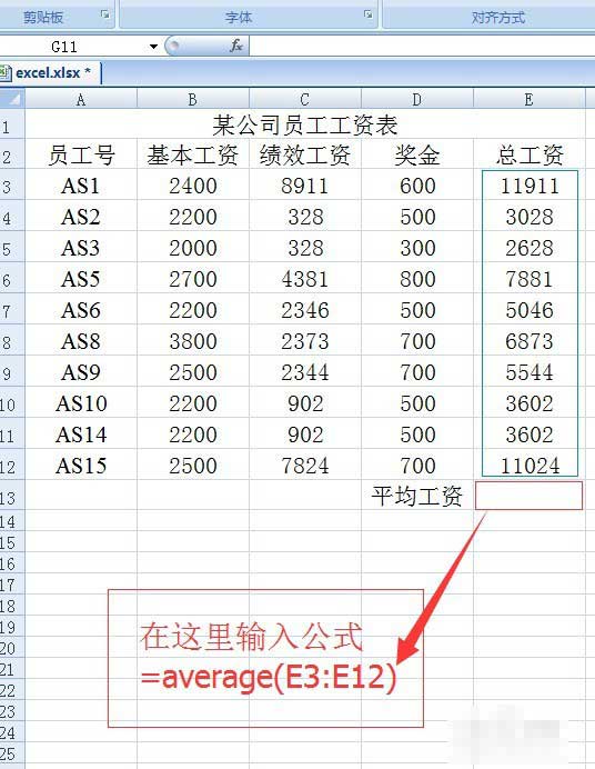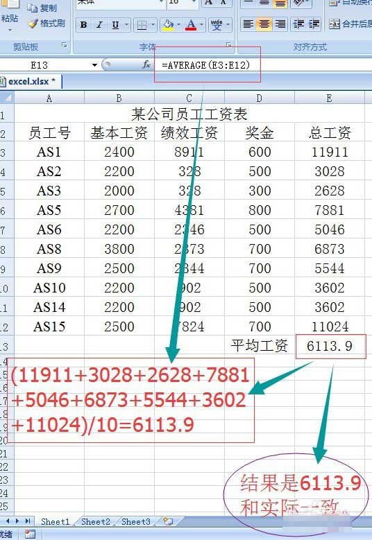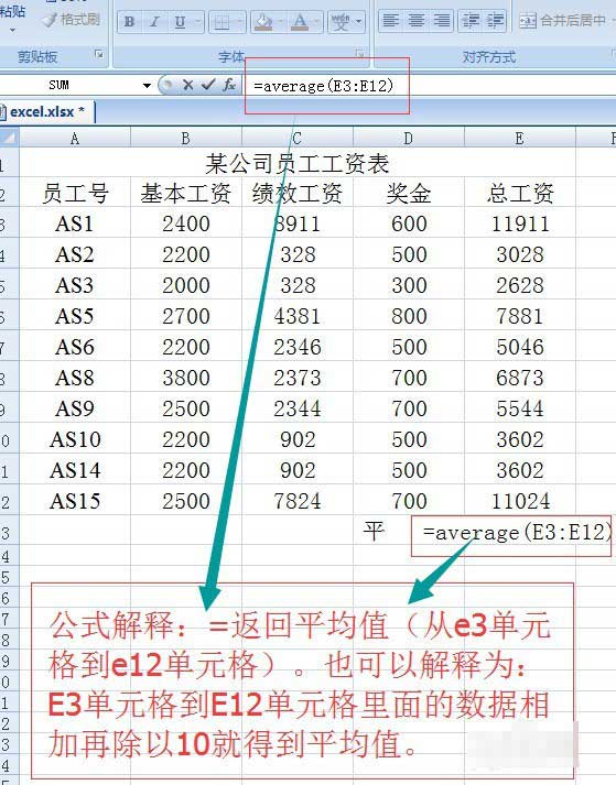 2、公式解释:=返回平均值(从e3单元格到e12单元格)。也可以解释为:E3单元格到E12单元格里面的数据相加再除以10(有10个人)就得到平均值。