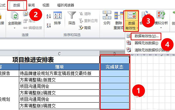 4、再回到前一个工作表,选中完成状态栏(整列选中),然后在菜单栏中选择数据,再选择数据有效性,在数据有效性的下拉列表中选择数据有效性(V),如图所示。
