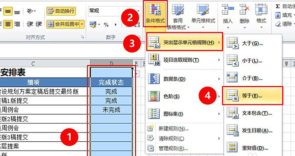 10、再选中工作状态一整列,再在菜单栏中点击开始,然后选择条件格式(如图示2),接着选择突出显示单元格规则,然后再选择等于。