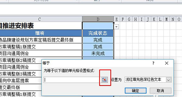 15、在按照第11步和第12步的方法选中第二个工作表中的“未完成”,填充颜色选择浅红填充色深色文本。