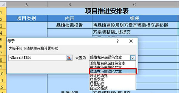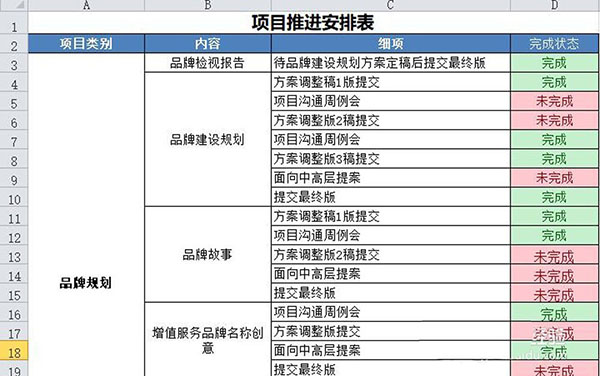 17、设置完成后我们就可以看到项目工作表格状态的设置已经完成,表格能根据表格内的状态情况分别显示为绿填充色深绿色文本和浅红填充色深色文本